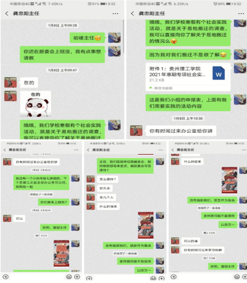 由于是疫情防控的特殊时期,调研准备工作完成后,邵安琼同学先与六枝特区梭戛乡长田坎居委会主任取得联系,商定现场调研的相关事宜。2021年1月21日,小组的现场调研正式开始,由于王阳同学家住遵义,主要负责线上资料的收集以及调研材料的整理工作,因此,本次线下实践走访以及调查主要由邵安琼和陈小志两名同学开展。