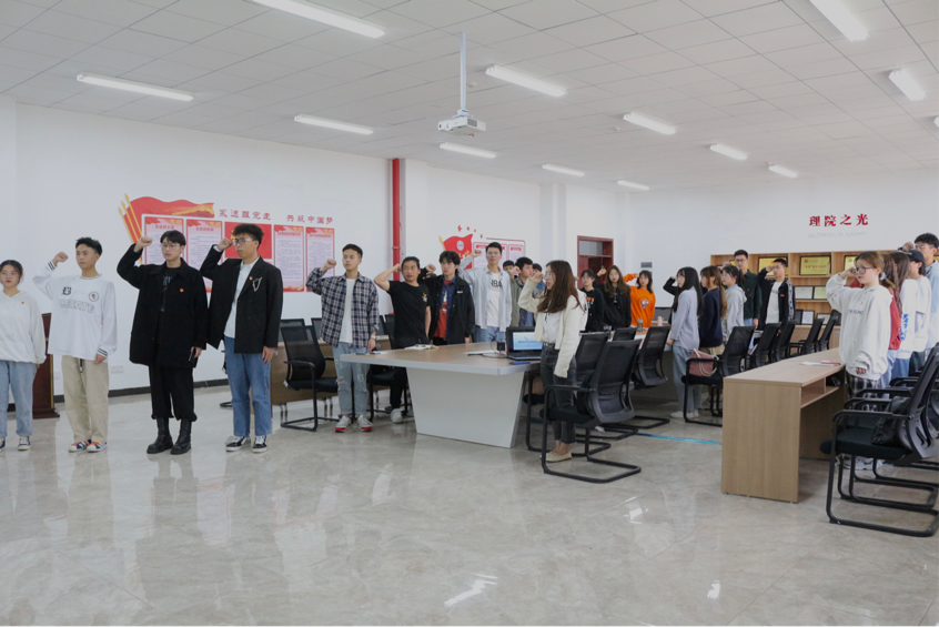 会议结束,理学院学生会临时团支部书记带领全体学生干部重温入团誓词。