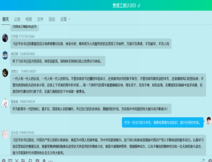 2021年5月7日统计203班团支部组织全班开展“青春向党,奋斗强国”的团组织生活,团支书陈福烨为大家讲述党史发展时间轴和历史意义,并深入了解长征精神,让同字们体会艰难苦境中的生活,又引领同学们学习习近平总书记重要讲话精神让同学们清楚自己的职责与担当,同学们积极发言:表示我们是新的一代青年人,要响应国家号召力,为新中国发展而努力,通过各种方式的讲解,引导同学们向党组织靠拢,奋斗青春。