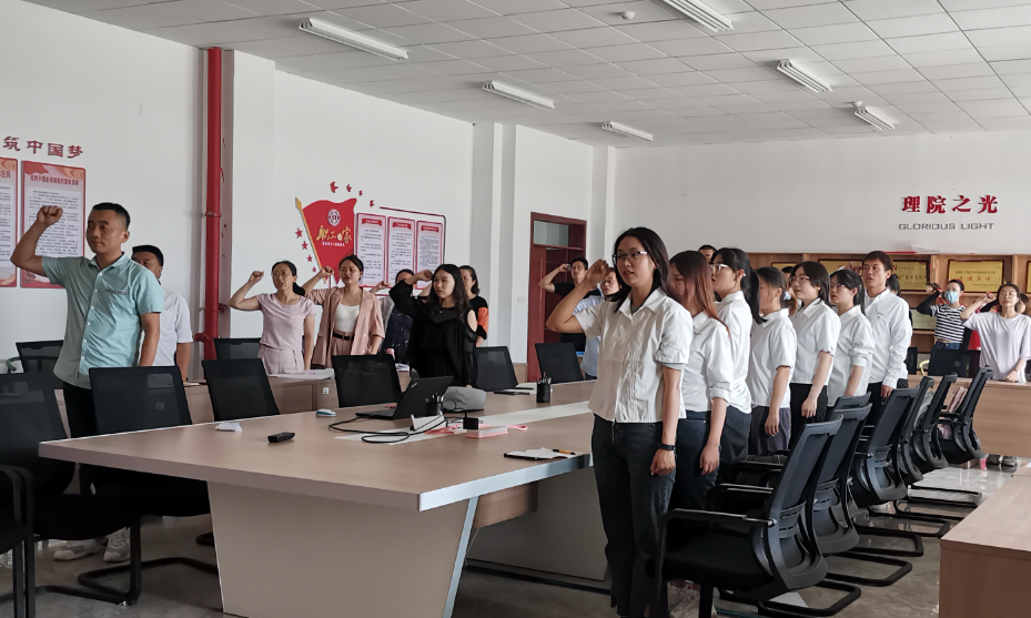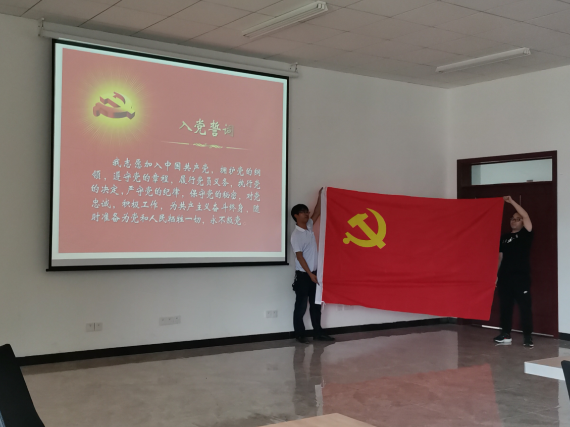 首先,主题党日的第一项活动是奏唱国歌,全体党员同志肃立,齐唱国歌;然后,由支部书记领誓,全体党员,包括6月23日刚吸收入党的新预备党员,面对党旗,庄严宣誓。