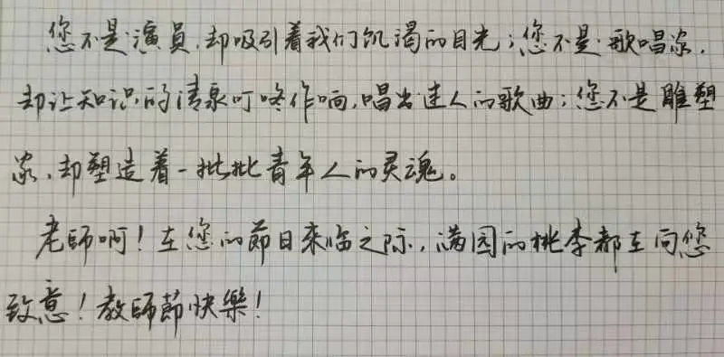 有人说教育本质是“一棵树摇动另一棵树,一朵云推动另一朵云,一个灵魂唤醒另一个灵魂。”饮其流者怀其源,学其成时念吾师,师恩永难忘,祝老师们节日快乐!--统计191 黄健豪