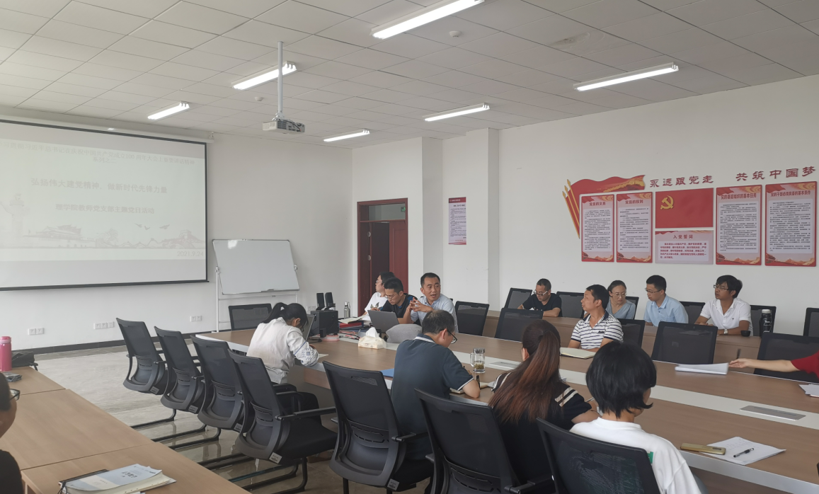理学院教师党支部于2021年9月24日在贵安校区知行楼理学院会议室举行了“关于开展深入学习贯彻习近平总书记在庆祝中国共产党成立 100 周年大会上重要讲话精神系列”的主题党日活动系列之二,主题为“弘扬伟大建党精神,做新时代先锋力量”。党支部书记张世功同志主持主题党日活动,全体处级党员干部都以党员身份参加了主题党日活动。