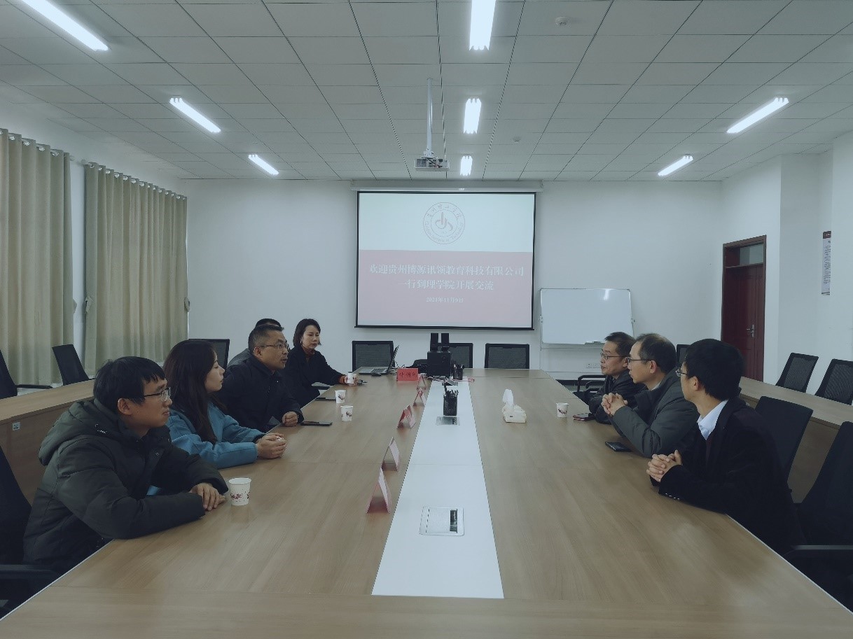 11月18日下午,贵州博源讯领教育科技有限公司总经理许懿,副总经理周玲、明略科技有限公司总经理王高亮等一行5人来理学院进行业务交流与研讨。理学院党总支书记黄念庆,副书记蒙蔺,副院长曾诚及应用统计学教研室相关教师一起出席了座谈交流会。