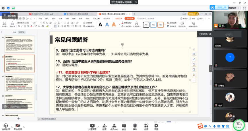 本次宣讲会,学院团总支邀请理学院2021届毕业生、参与2021年西部计划的张曼同学连线,张曼同学在线上就个人参与西部计划选拔的经验及参加西部计划去到基层岗位工作一年的感受与同学们进行了分享,鼓励2018级同学参与到西部计划项目,实现自己的青春使命。宣讲会后张梦老师对同学们的问题都进行了一一解答,张梦老师表示,后期学院将针对本次参与西部计划报名的同学开展专项培训及座谈会,帮助大家准备西部计划相关选拔。