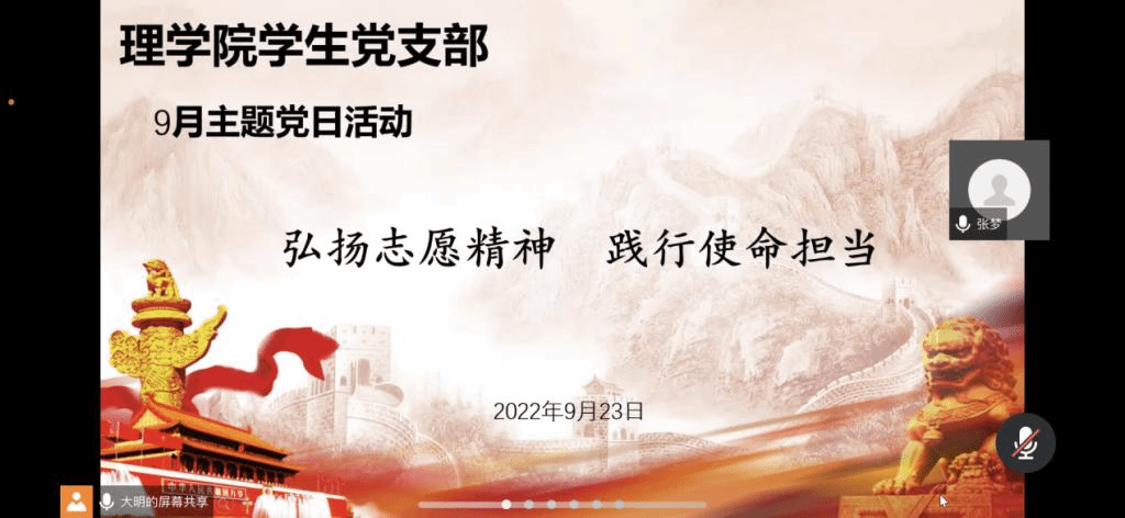理学院学生党支部于2022年9月23日召开“弘扬志愿精神 践行使命担当”主题党日活动,由于疫情的影响,此次会议利用腾讯会议采用线上的方式召开,本次主题党日活动由张梦老师带领大家学习,活动共分为两项内容,一是:学习《让群众过上好日子—习近平正定足迹》一书节选;二是:党员讲故事。
