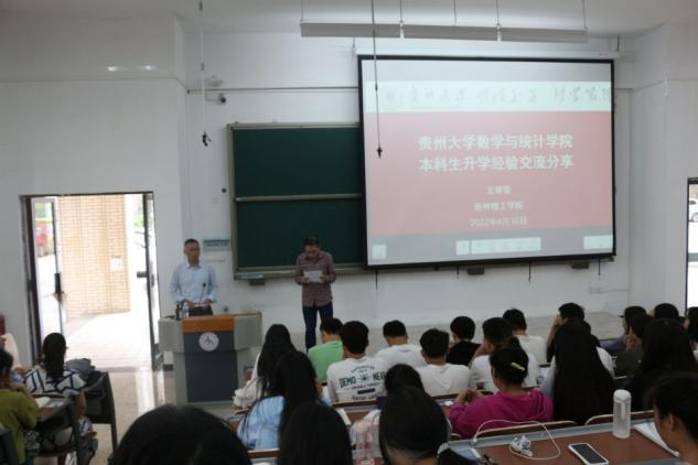 王锦荣教授首先对贵州大学数学与统计学院的相关学科进行介绍,讲述其学科特色、学科影响等。继而,王锦荣教授根据贵州大学数学与统计学院学风建设情况、课程设计方面与现场老师同学展开交流,强调指出学院应当积极引导,高度重视学风建设。王教授通过介绍学院领导班子、学院优秀人才与到场的老师探讨学生培养体系建设,并介绍了贵州大学数学与统计学院引入人才培养方案——“党建+”育人新模式,在此模式下,以数据的形式呈现出近5年来数学与统计学院学子的考研率及四六级过级率的逐步提升,给出结论:想成功必须重投入,讲勤奋。在问答环节中,王锦荣教授针对同学们提出的就业考研形势严峻,我们应怎样适应大环境的问题,给出了我们应当凭借出色的能力和实力来适应社会的观点。