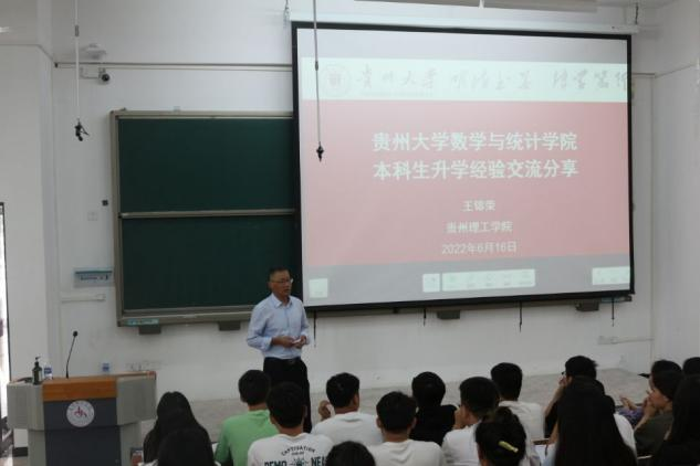 2022年6月16日16点,理学院邀请到贵州大学二级教授、博士生导师,现任贵州大学数学与统计学院院长王锦荣教授来校,于开物楼G1109为我院同学主讲“考研、职业规划、学科竞赛”专题讲座。理学院副院长曾诚、高等数学教研室副主任刘葵、应用统计教研室教师胡曙、黄磊出席现场,理学院2019级、2020级及2021级全体同学参加本次讲座。