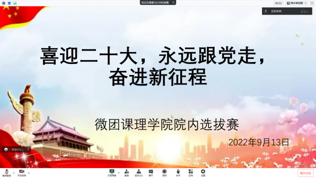 为深入学习贯彻习近平新时代中国特色社会主义思想,特别是习近平总书记在庆祝中国共产主义青年团成立100周年大会上的重要讲话精神。理学院于2022年9月13日在线上开展主题为“喜迎二十大,永远跟党走,奋进新征程”的“微团课”院内选拔赛。本次“微团课”选拔赛由理学院党总支书记黄念庆,团总支副书记张梦,理学院团总支学生副书记周义担任评委,理学院团总支组织部部长马兴月主持,各参赛队伍及理学院2021级,2022级全体同学参加。