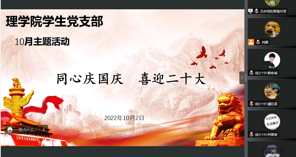 本网讯(理学院 陶鲜/图文)为庆祝新中国成立73周年,喜迎二十大的顺利召开,理学院学生党支部于2022年10月2日召开“同心庆国庆,喜迎二十大”主题党日活动。本次会议利用腾讯会议线上进行,由支部书记吕井明主持,学生支部全体成员参与。会议共两项议程,一是学习党史;二是主题党日活动观看电影《建国大业》,各支部成员进行讨论交流,最后观看新中国成立73周年升旗仪式。