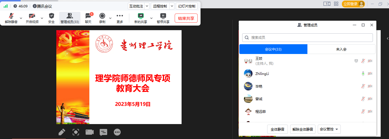 2023年5月19日下午,理学院组织召开师德师风专题教育大会,蔡家关校区的老师们通过网络会议方式参加大会,理学院党总支副书记章丽娥主持会议。