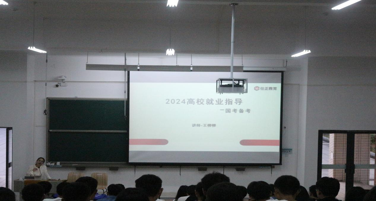 为提升学生就业意识和竞争力,做好就业工作,2023年5月25日19点,我院携手仕正教育机构在贵安校区开物楼G1110教室开展了主题为“2024高校就业指导--国考备考”讲座。本次讲座由仕正教育机构资深讲师王柳柳主讲。