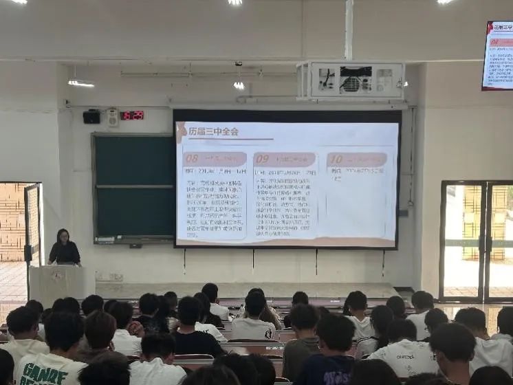 章丽娥首先从党的历届三中全会讲起,将同学们带到了中国特色社会主义现代化建设的历史大潮中,感受一代又一代的国家领导人在不同历史时期的施政重点和改革的决心。宣讲重点围绕习近平总书记在党的二十届三中全会上发表的重要讲话精神和全会审议通过的《中共中央关于进一步全面深化改革、推进中国式现代化的决定》进行阐述。她指出,党的二十届三中全会是在新时代新征程上,中国共产党坚定不移高举改革开放旗帜、开创中国式现代化建设新局面时期召开的一次十分重要的会议,全会通过的《决定》是新征程上进一步全面深化改革的重要纲领性文件,要求同学们要深刻学习领会习近平总书记在全会上的重要讲话精神,深刻认识党的二十届二中全会以来党和国家事业取得的重大成就,深刻认识进一步全面深化改革的重要性和必要性、重大原则,全面理解《决定》提出的进一步全面深化改革的重大举措,增强贯彻全会精神的思想自觉和行动自觉,衷心拥护“两个确立”、忠诚践行“两个维护”。