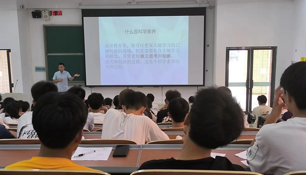 张世功作大学生科学素养提升教育和应用物理学专业介绍,展示了应用物理学特别是无损检测的应用实践和重要意义。他倡导同学们在大学期间要早做规划,积极主动去寻找自己的兴趣,大胆实践,增强执行力,提高自己的科学素养,以实事求是脚踏实地的科学精神探索世界。