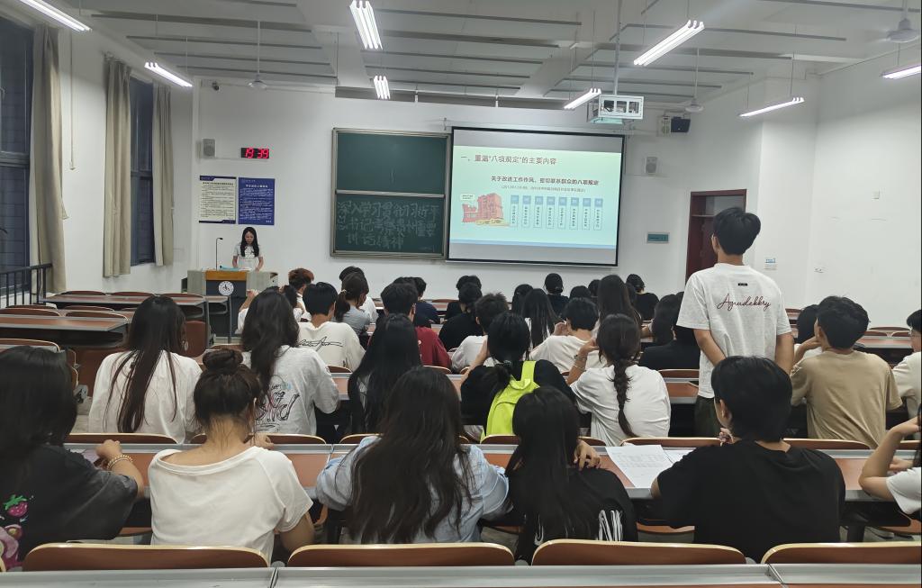 罗意与同学们共同回顾八项规定的核心内容,从改进调研、精简会议等八个方面进行详细阐释,并结合校园实际案例,针对作风不正等问题,启发同学们进行自我对照和反思。