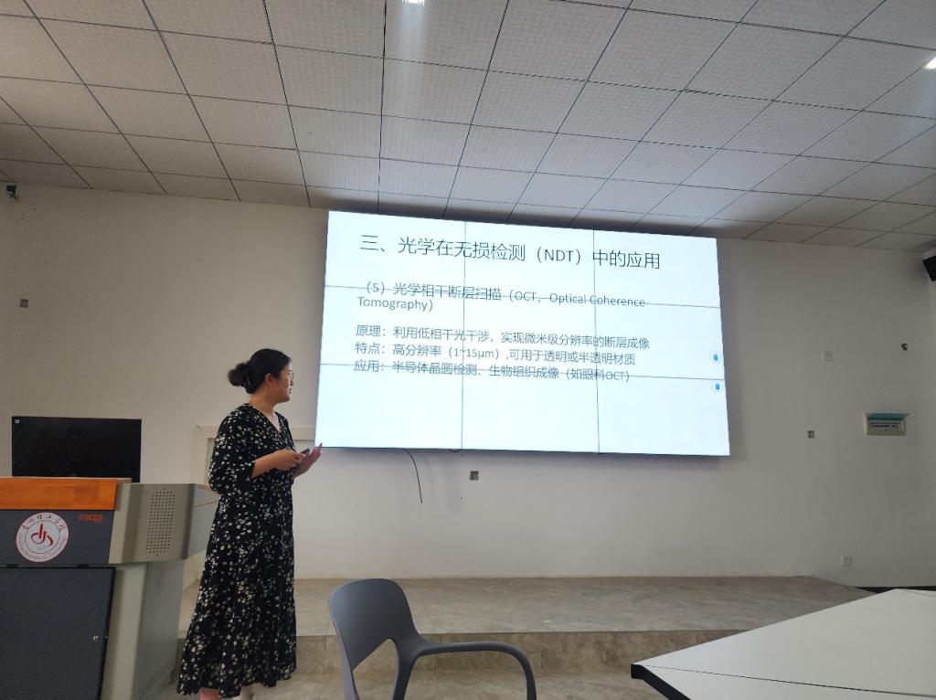 李晓利老师就《光学》课程进行了系统汇报。她系统梳理了课程知识体系,重点阐释光学在无损检测领域的实践应用,并对教材选用、教学大纲进行详细解读。《光学》作为应用物理专业大二学生的专业基础课,需在夯实物理基本原理、提供扎实理论基础的同时,紧密对接无损检测专业方向需求,进行合理的教学内容调整,注重培养学生运用物理原理解决实际工程问题的能力。