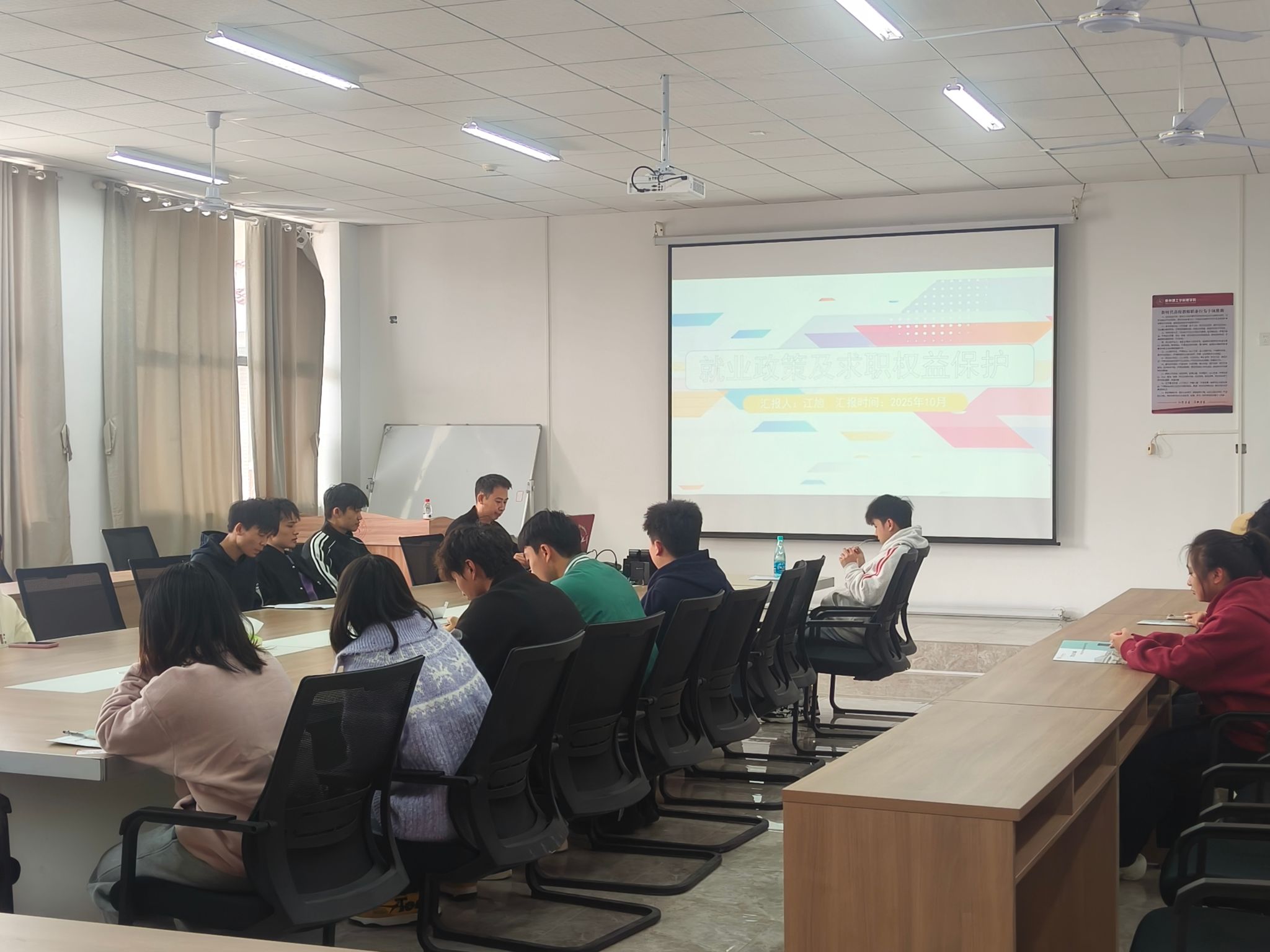 为帮助统计221班学生明晰就业方向、增强就业权益保护意识,2025年10月23日,理学院于2526会议室举办“就业政策解读与求职权益保护”专题宣讲会。辅导员江旭及统计221班全体同学参加活动。