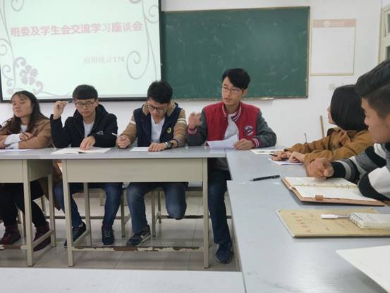 (理学院统计174班 冷将文 报道)由理学院统计174与土木工程学院土木162两个班级全体班委组织举办的‘班委谈心交流座谈会’于2017年11月16日早8:00在3教208室举行。会议由统计174班班长徐华坤主持,统计174班班主任周靖楠及两个班级全体班委共同参加座谈会。