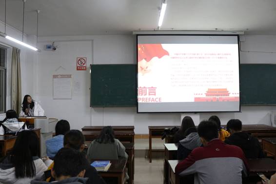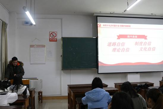 随后,在张晨恺同学宣讲的十九大精神中,“四个自信”以及“四个意识”也更加激发了同学们在新时代际遇中的奋斗精神,全新认识了当代青年对历史使命的责任与担当。宣讲结束,《不忘初心继续前行》纪录片的放映更加深了同学们对十九大报告的认识,正确认识了不忘初心跟党走的自觉性,坚定性,也更加自发地紧密团结在以十九大精神为核心的思想中举旗前行。