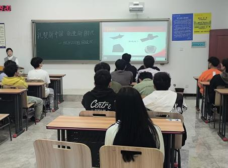 宏伟蓝图鼓舞人心,时代号角催人奋进。团支书吴文婧从国家发展、革命任务和世界角度三个方面分别给同学们讲述了新中国成立的伟大历史意义。她指出,1949年10月1日,中华人民共和国的成立,开辟了中国历史新纪元,从此,中国结束了一百多年来被侵略、被奴役的屈辱历史,真正成为独立自主的国家。从这一刻起,中国开始了艰苦卓绝的奋斗历程。