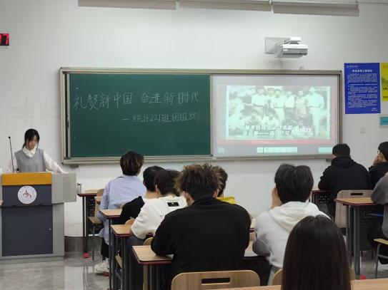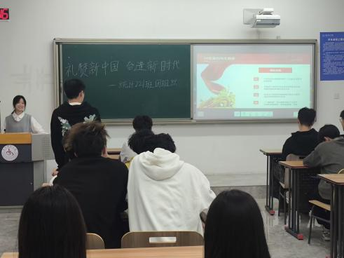 为热烈庆祝中华人民共和国成立74周年华诞,激发青年爱国主义情感,进一步加强大学生思想道德建设,2023年10月18日,统计221班团支部组织全班同学在天工楼G1204教室开展了以“礼赞新中国,奋进新时代”为主题的团组织活动。
