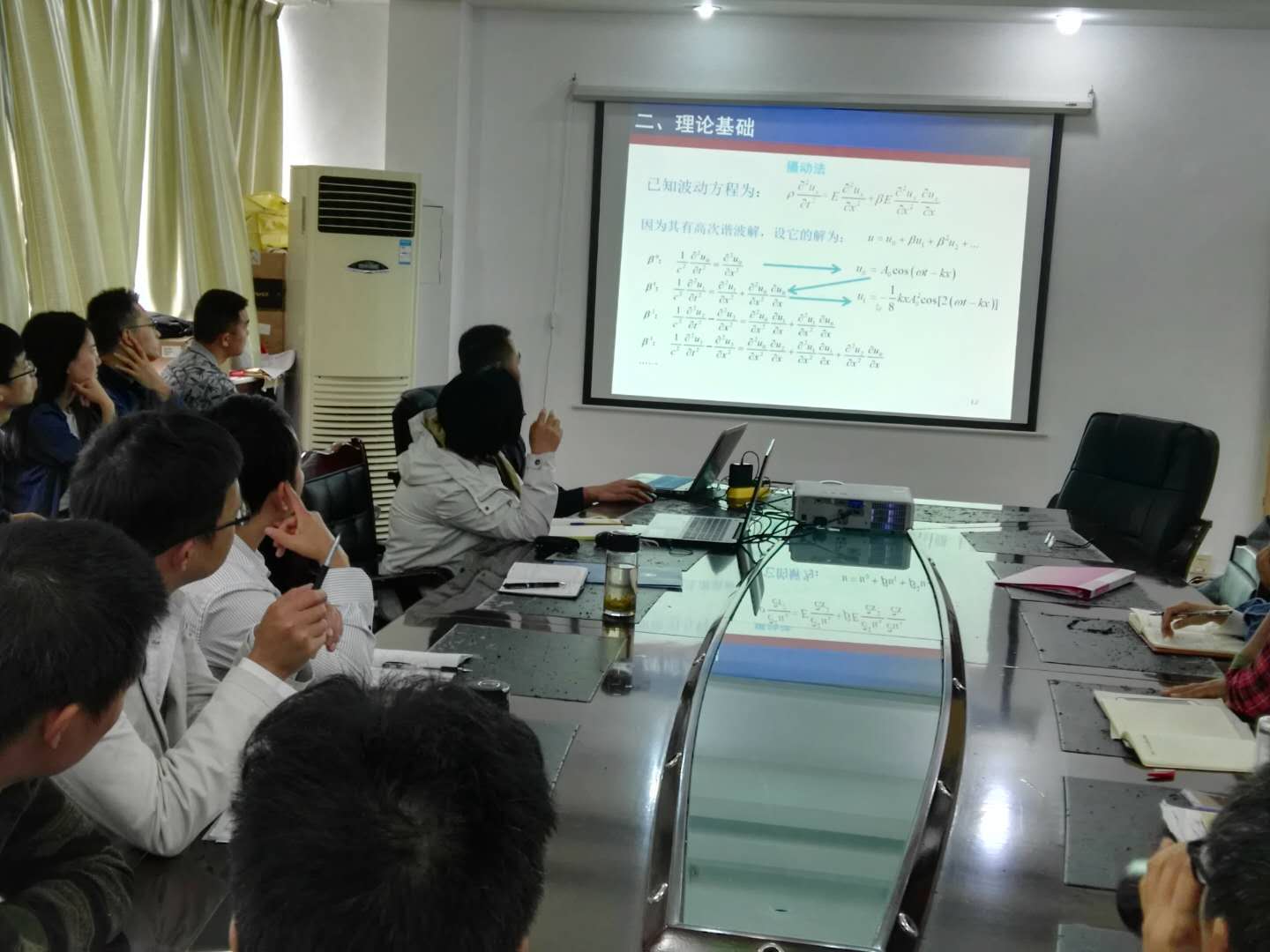 报告中,张世功从理论上所利用的非线性偏微分方程出发,与数学老师展开了方程解的讨论;然后从物理上探讨了非线性超声谐波的传播性质,最后对低强度超声在医学方面的应用进行了介绍。