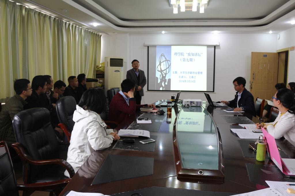 (理学院 张梦 报道)3月26日中午13时,理学院第9期“致知讲坛”在主楼八楼理学院会议室举行,理学院全体教职工参加了此次讲坛。理学院副院长王春江研究员担任主讲嘉宾,王春江以“大学生创新创业管理”为题,与大家分享了自己的研究心得与见解。
