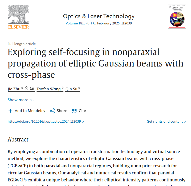 朱洁老师以第一作者身份在期刊《Optics and Laser Technology》上发表题为“Exploring self-focusing in nonparaxial propagation of elliptic Gaussian beams with cross-phase”的研究论文。https://doi.org/10.1016/j.optlastec.2024.112039