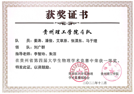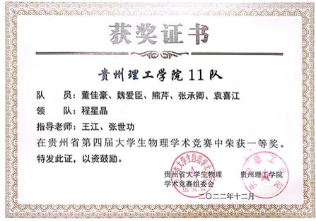 自2019年至今贵州省大学生物理学术竞赛举办已举办四届,在学校各部门的支持下,理学院每年认真组织选派学生参加,迄今共获得省赛一等奖5队次、二等奖3队次、三等奖11队次,两名同学分别获得过全省最佳反方(全省第一名),最佳评论方(全省第二名),十余名老师获得优秀指导老师,在省内二十余支高校中名列前茅。2022年12月,理学院成功承办了贵州省第四届大学生物理学术竞赛,取得参赛高校和参赛队伍的一致好评。现将竞赛工作总结如下: