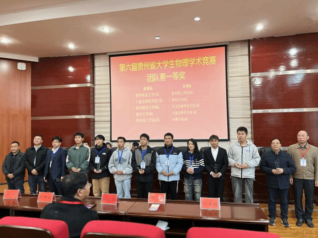 2024年11月30日,贵州省第六届大学生物理学术竞赛(GZUPT)决赛于六盘水师范学院举行,理学院通过校赛选拔出来自化工、材料、智电、大数据、理学院等学院的14名学生,组成四支队伍,同来自贵州大学、贵州师范大学等省内13所高校的130余名优秀选手进行了激烈对抗。我校选派的两支团队双双获得省级一等奖,两支个人队伍也获得了作品赛省级二等奖。此外,智电学院的甘焱宁同学获得了最佳评论方。理学院张世功副院长带队参赛并受邀担任本届竞赛的副秘书长和副裁判长。