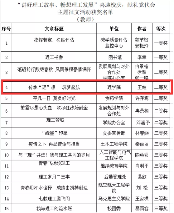 日前,校党委宣传部印发文件,对我校开展的“讲好理工故事、畅想理工发展”喜迎校庆,献礼党代会主题征文活动获奖师生进行了表彰。我院学生科辅导员王姣老师的作品荣获二等奖。