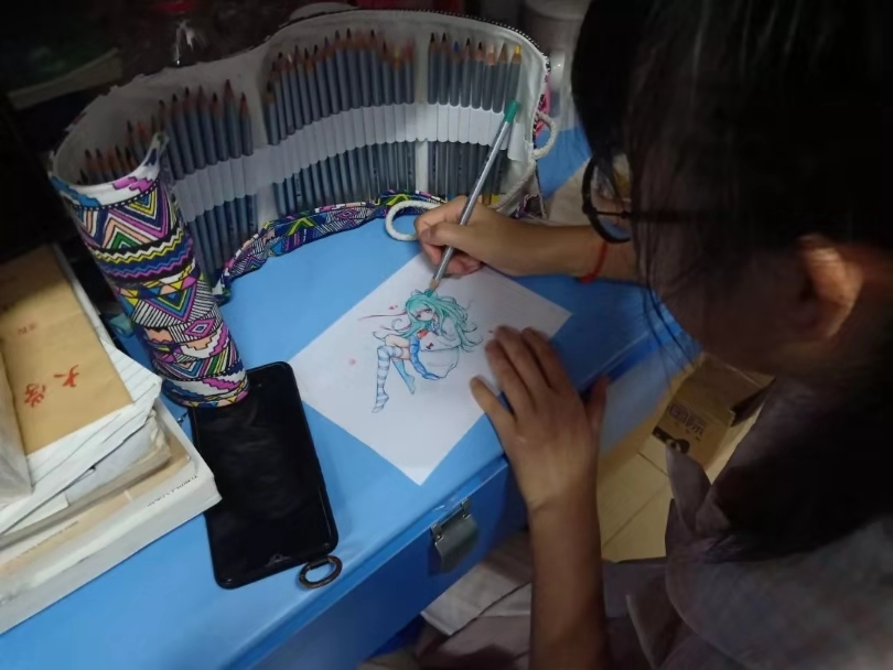 Y:我从初二就开始自己去试着画了,以前是用手绘。到了高中才开始用手机软件(画世界)平时也会手绘。颜色是我先搭配好了然后大家一起投票选的。