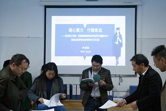 (本网讯 卢源源)2017年11月29日,由省招生考试院自考处处长张琳、贵州师范学院继续教育学院党总支书记、贵阳市考试中心、贵州大学、贵州民族大学和贵州医科大学等组成的专家组一行莅临我校开展“省级高等教育自学考试学习服务中心”建设达标及自考助学工作评审。副校长梁杰,继续教育学院、教务处、招生就业处、计划财务处等相关领导、继续教育学院全体教职工参加了评审会议。评审会在继续教育学院会议室举行。