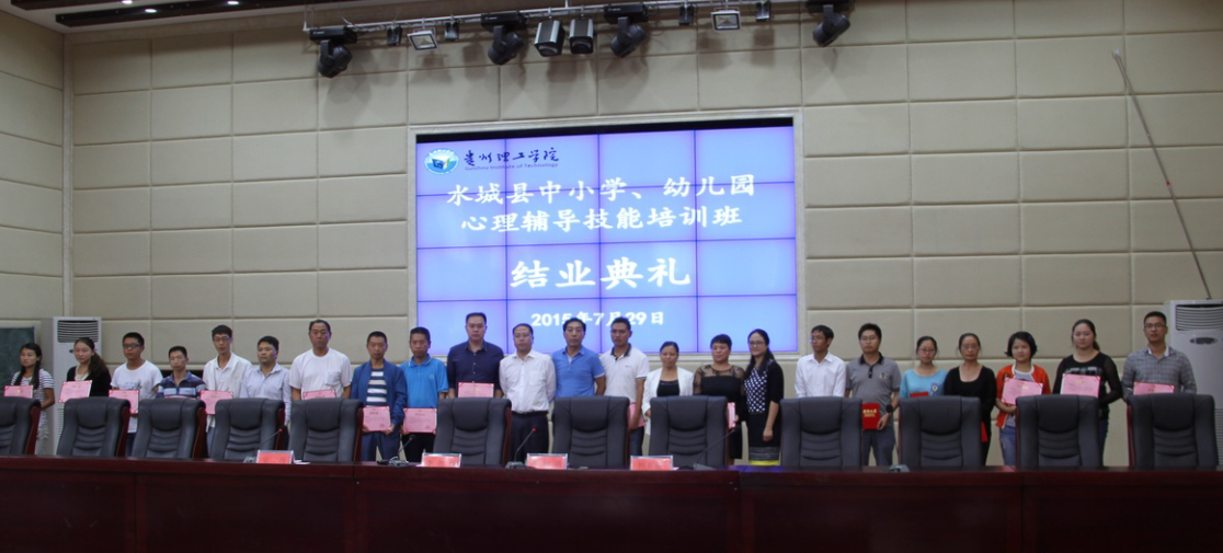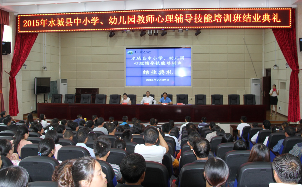 7月29日下午,水城县中小学、幼儿园教师心理辅导技能培训班在全体学员表演的手语歌曲“感恩的心”中落下帷幕,贵州理工学院职业技术师范学院院长李辅敏教授、水城县教育局副局长李德福以及340名来自水城县中小学、幼儿园的教师参加了结业典礼。