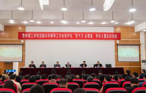 本网讯(学生工作部 江旭/文)为切实加强我校学风建设,激励与引导全体师生以饱满的精神面貌迎接本科教学工作合格评估,10月30日,贵州理工学院在喀斯特报告厅组织召开迎接本科教学工作合格评估学风大整治启动会。校领导曾羽、苏向东、梁杰、宋建波、胡兴灿、高勇出席会议,学风建设工作领导小组全体成员、各学院党政负责同志、各学院学生科科长(副科长)、辅导员、班主任及学生代表参加会议。会议由党委副书记高勇主持。