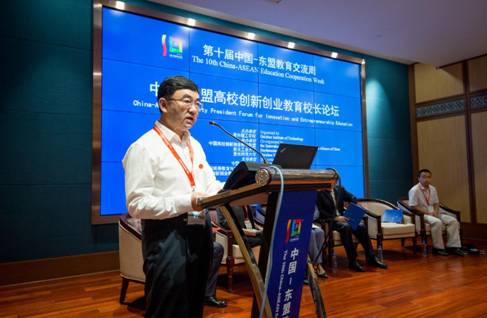 贵州理工学院党委书记曾羽代表学校致辞,对参加本届中国-东盟教育交流周及中国-东盟高校创新创业教育校长论坛的嘉宾表示热烈欢迎。就贵州理工学院建校四年来建设发展情况作了介绍,同时指出创新创业教育是贵州理工学院深化教育教学改革、推动OBE工程教育模式实施、提高人才培养质量的强力引擎。他表示,推动创新创业教育发展,不仅是贵州省实施产业转型发展战略的迫切需要,而且是推动贵州发展从要素驱动转向创新驱动的必然要求。本次论坛以“凝聚共识、共享创新——构建中国—东盟创新创业教育共同体”为主题,旨在推动大学的组织创新,完善多主体协同育人机制,突破国内外参与人才培养的体制机制障碍,建设一批集教育、培训及研究于一体的共享型创新创业人才培养实践平台;旨在深化中国-东盟高等院校间的交流合作,引发文化与文化的深入交流、思想与思想的不断碰撞,激发出更好的创新思维火花,寻找到更佳的创业机会,最终实现创新创业的成果向纵深、务实、专业化、可持续的方向发展。