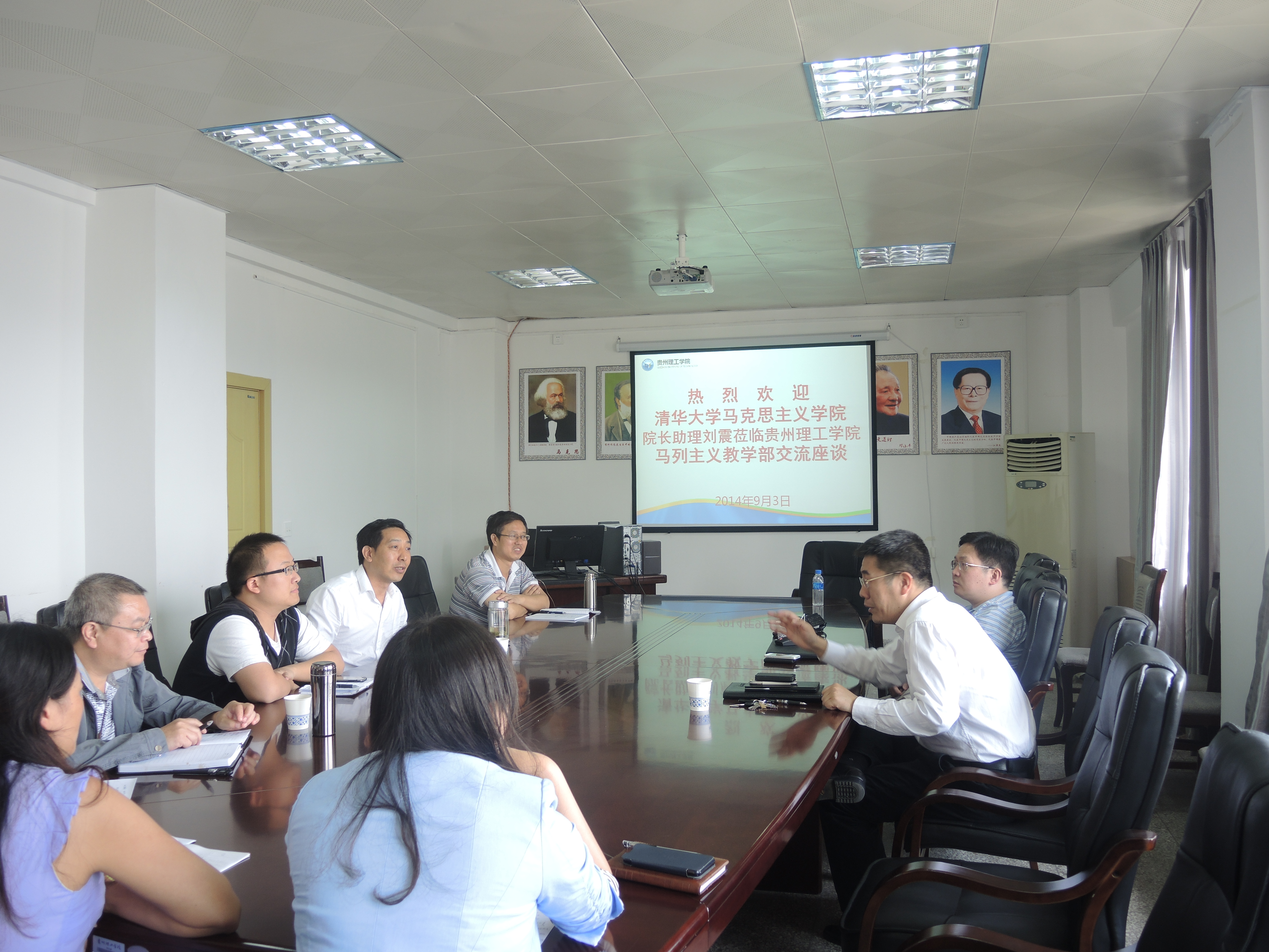 (本网讯)2014年9月3日上午9时,清华大学马克思主义学院院长助理刘震博士到贵州理工学院马列部,与马列部教师就《马克思主义原理概论》课实施“慕课”教学交流座谈。校长龙奋杰教授、马列部主任李辅敏教授、敖以深书记参加了座谈会,座谈会由马列部主任李辅敏教授主持。