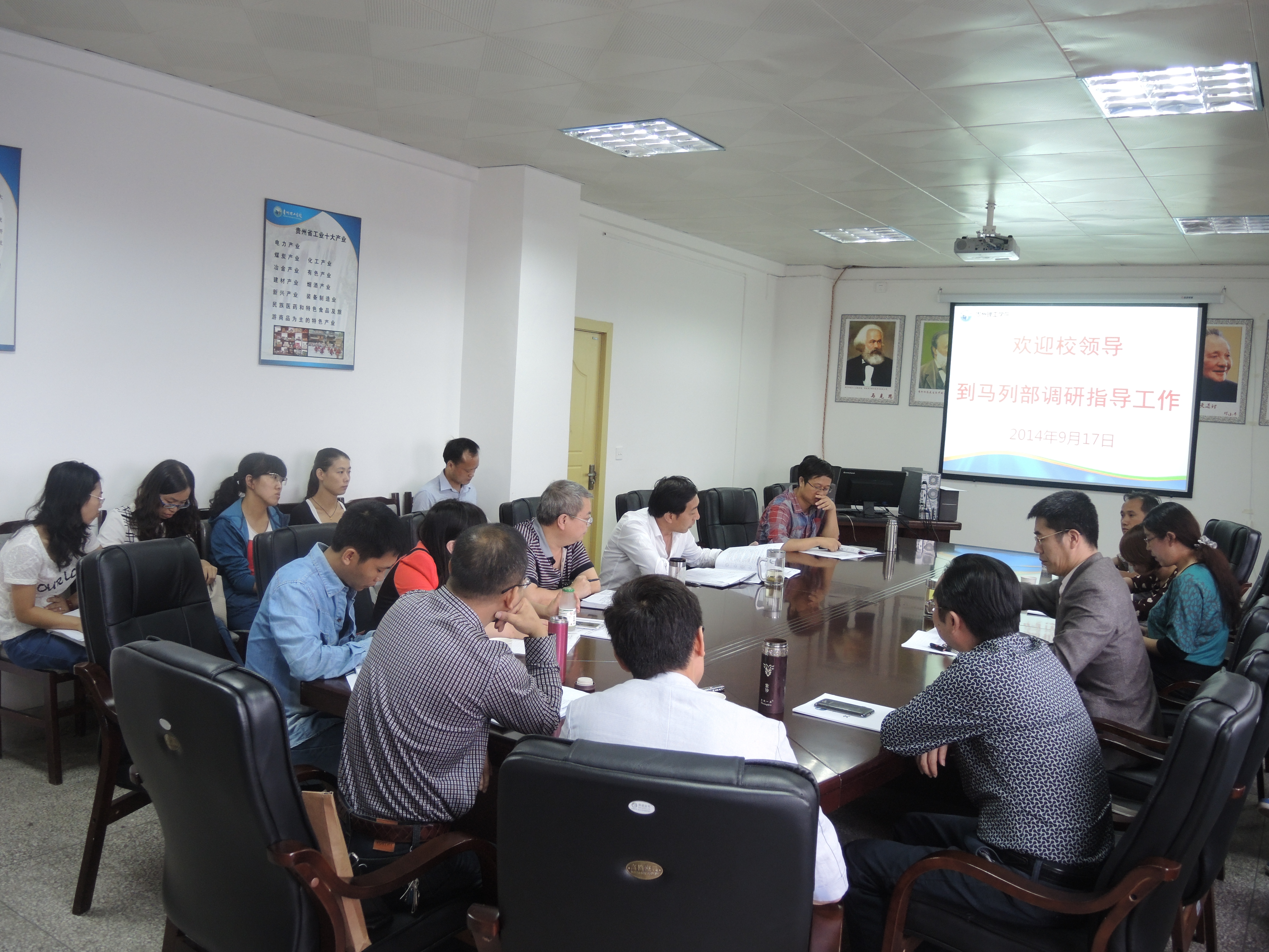 2014年9月17日下午,龙奋杰校长、校纪委蒙忠书记、校办副主任郑伟,教务处副处长邵芳教授,吴维义、邓莲丽副处长等到马列主义教学部开展调研活动。马列部主任李辅敏教授、敖以深书记及全体老师参加了调研活动。