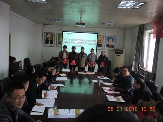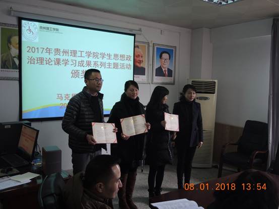 表彰会上,敖以深院长总结了2017年贵州理工学院学生思想政治理论课学习成果系列主题活动的开展情况,并对 “思政课学习之星”、“践行核心价值观·凝聚最美中国梦”学生讲思政课公开课展示和“我心中的思政课”微电影展示等系列主题活动中表现突出的师生进行了表彰。金敏书记和欧阳德君副院长分别为获奖的指导教师和学生颁奖。