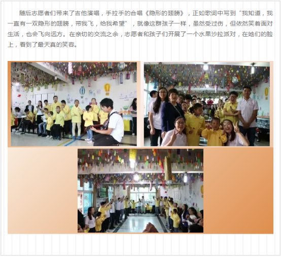 随后志愿者们带来了吉他演唱,手拉手的合唱《隐形的翅膀》,正如歌词中写到“我知道,我一直有一双隐形的翅膀,带我飞,给我希望”,就像这群孩子一样,虽然受过伤,但依然笑着面对生活,也会飞向远方。在亲切的交流之余,志愿者和孩子们开展了一个水果沙拉派对,在她们的脸上,看到了最天真的笑容。