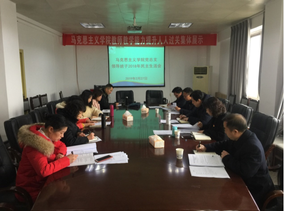 本网讯(马克思主义学院 王香莲/文 张建军/图)根据上级党委2018年处以上党员领导干部民主生活会实施方案的有关要求,马克思主义学院党总支领导班子以“强化创新理论武装,树牢 ‘四个意识’,坚定‘四个自信’,坚决做到‘两个维护’,勇于担当作为,以求真务实作风坚决把党中央和省委各项决策部署落到实处”为主题,于2019年2月27日上午10点,召开领导班子民主生活会,开展批评和自我批评。联系校领导校党委副书记张波出席指导,各教研室和科室负责人列席会议。