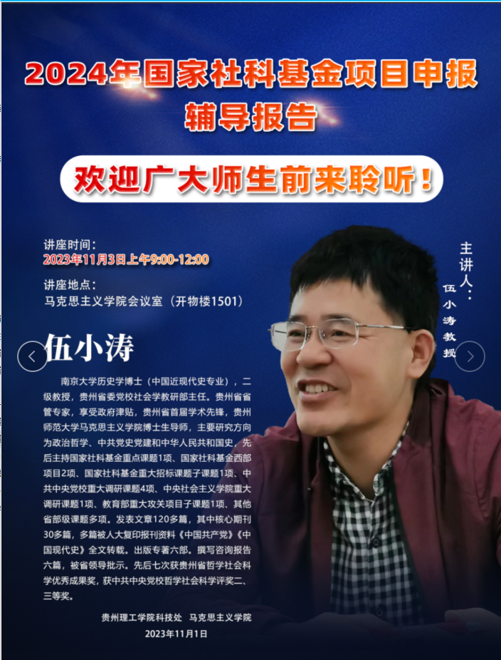 本网讯(马克思主义学院 吴园园/文/ 张建军/图)为做好马克思主义学院2024年国家社科基金项目申报工作,切实提升教师项目申报质量,11月3日马克思主义学院特邀南京大学历史学博士,二级教授,贵州省委党校社会学教研部主任。贵州省省管专家,贵州省首届学术先锋,贵州师范大学马克思主义学院博士生导师伍小涛教授对国家社科基金项目申报进行专题辅导。贵州理工学院纪委书记贺梦依教授、马克思主义学院党总支书记华岚、副院长杨立杰出席,教师工作部、建筑与城市规划学院、经济管理学院、体育学院、外国语学院部分教师和马克思主义学院专兼职思政课教师参加,活动由马克思主义学院副院长欧阳德君主持。