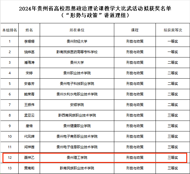 近日,2024年贵州省高校思想政治理论课教学大比武活动评选结果揭晓,马克思主义学院郭勤艺老师获本科“马克思主义基本原理”课程组三等奖,聂祥乙老师获“形势与政策”讲道理组三等奖。