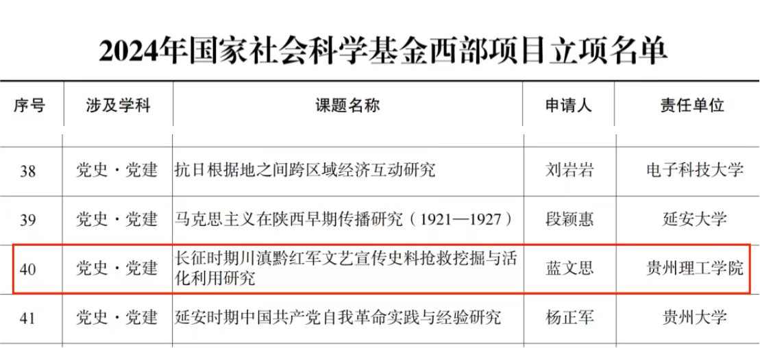 2024年10月16日,全国哲学社会科学工作办公室发布了2024年国家社会科学基金年度项目的立项结果。我院蓝文思副教授申报的《长征时期川滇黔红军文艺宣传史料抢救挖掘与活化利用研究》成功获批国家社科基金西部项目立项。我院高质量课题年度项目立项取得重大突破。