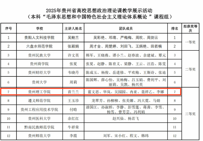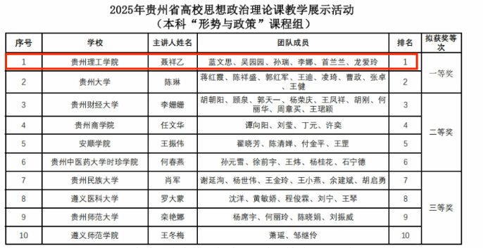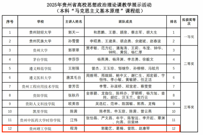 本网讯(马克思主义学院 吴园园/文、图)近日,第四届全国高校思政课教学展示活动贵州省初赛获奖结果公示,我院聂祥乙老师及其教学团队荣获本科组《形势与政策》课程组一等奖,被推荐参加全国高校思政课教学展示活动。《习近平新时代中国特色社会主义思想概论》《毛泽东思想和中国特色社会主义理论体系概论》《马克思主义基本原理》分别荣获三等奖。