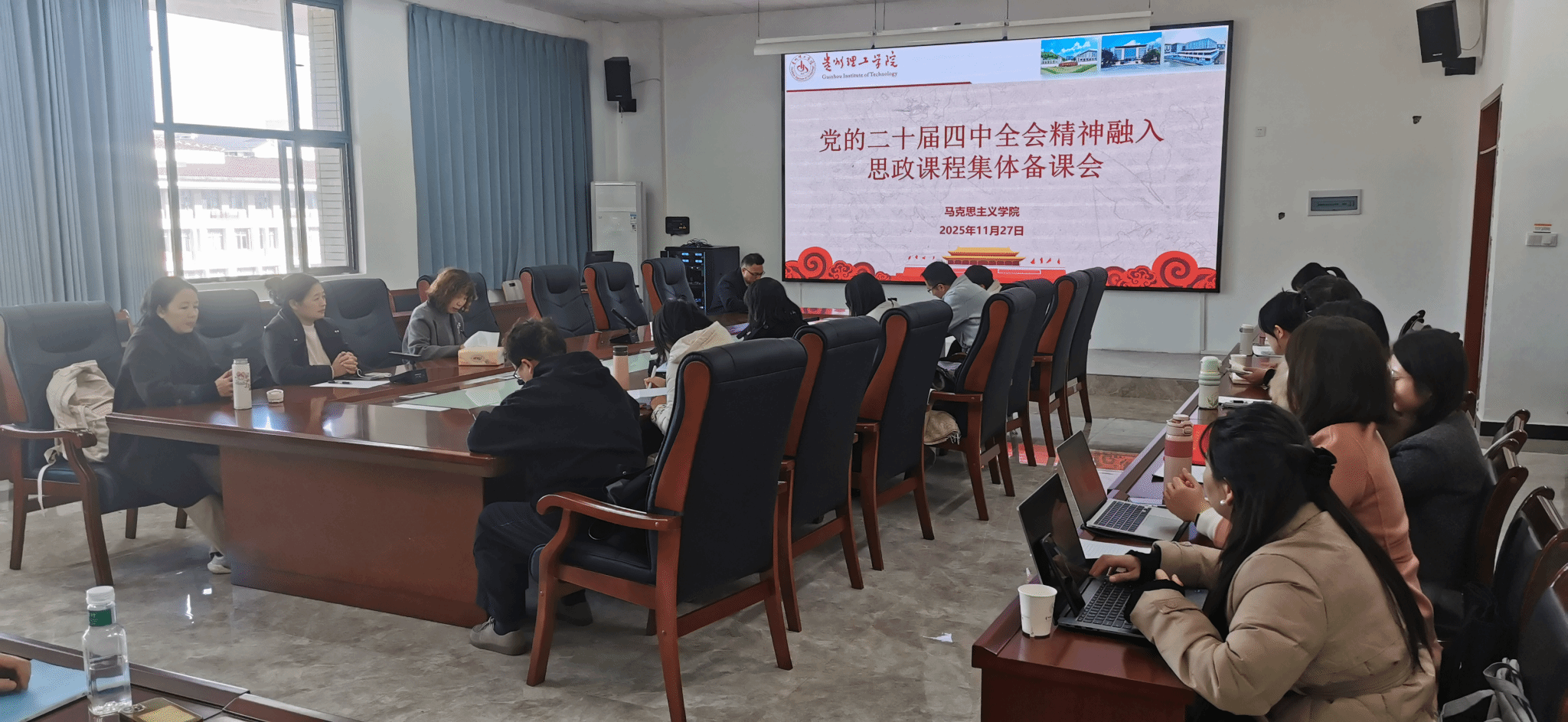 本网讯(马克思主义学院 吴园园/文、张建军/图)2025年11月27日下午,马克思主义学院在开物楼1507会议室开展党的二十届四中全会精神融入思政课程集体备课会,以集体智慧破解“为何融”“融什么”“如何融”的核心命题,推动全会精神与思政教学深度融合,切实提升教学质量与育人实效,全面落实立德树人根本任务。学院全体思政课教师参加会议。