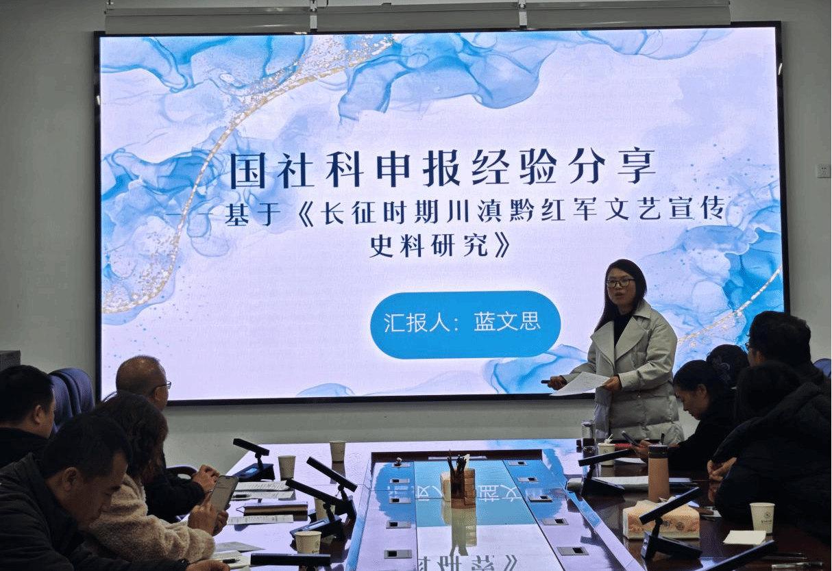 随后,马克思主义学院蓝文思老师结合自身成功申报国家社科基金项目的实践经历,从前期研究基础搭建、申报材料系统准备、内容细节精雕细琢、申报心态调适等方面,分享了极具实操性的申报经验,为参会教师提供了鲜活的参考样本。