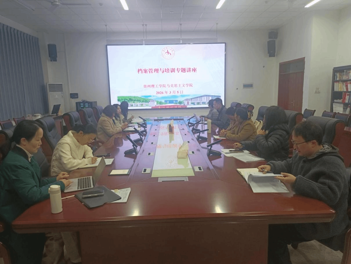 本网讯(马克思主义学院 甄江燕/文 甄江燕/图)2026年3月5日9:00,马克思主义学院邀请图书馆(档案馆)综合档案室副主任邓涵予老师到开物楼1507会议室现场培训和指导学院档案管理工作,学院领导班子、科室负责人、党支部书记、组织员以及档案管理专员参加培训。通过培训,大家对《贵州理工学院档案管理办法》及《贵州理工学院档案立卷归档工作规范》进一步了解和熟悉,更加认识到学院档案管理工作的重要性和紧迫性,为学院进一步理顺工作机制,常态化、标准化开展档案管理工作奠定了坚实基础。