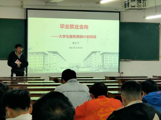 为使学生们更全面地了解西部计划,做好西部计划宣传招募工作,引导和鼓励优秀大学生参与到志愿服务中,增加学生的就业去向。2021年11月3日19:30,机械工程学院辅导员张小千面向2018级机械设计制造及其自动化专业的全体同学,在3-216开展了大学生服务西部计划项目的宣讲讲座。