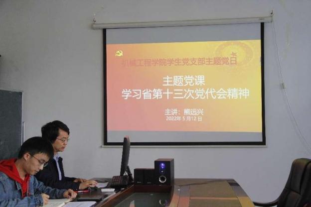 2022年5月12日,机械工程学院学生党支部开展“学习省第十三次党代会精神”主题党日活动,党总支书记熊远兴为学生党支部全体党员讲党课。