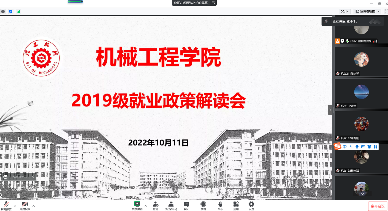 为进一步推进我院2019级学生就业指导工作,帮助毕业生尽快了解就业形势、增强择业意识,2022年10月11日19点,机械工程学院组织召开2019级线上就业政策解读会,此次会议由辅导员张小千主讲,机械工程学院2019级全体学生参加。